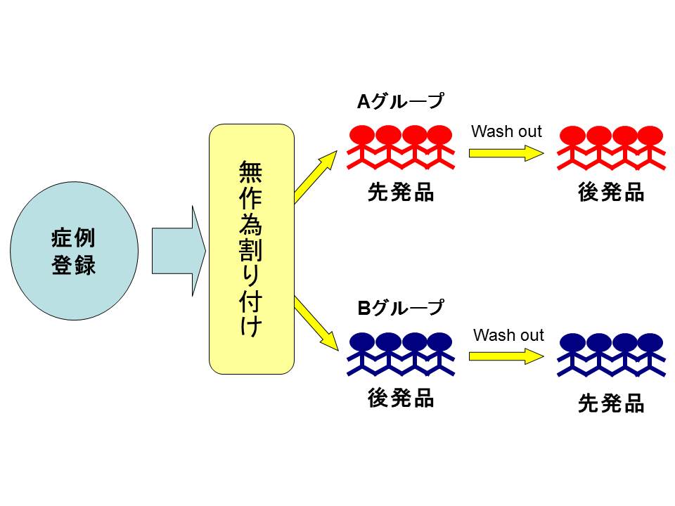クロスオーバー法とは、2群に無作為割付を行い、あるグループには、先発品→後発品を服用し、もう一方のグループでは後発品→先発品と服用して効果をみる試験方法をいいます。生物学同等性試験のガイドラインにクロスオーバー法が記載されています。