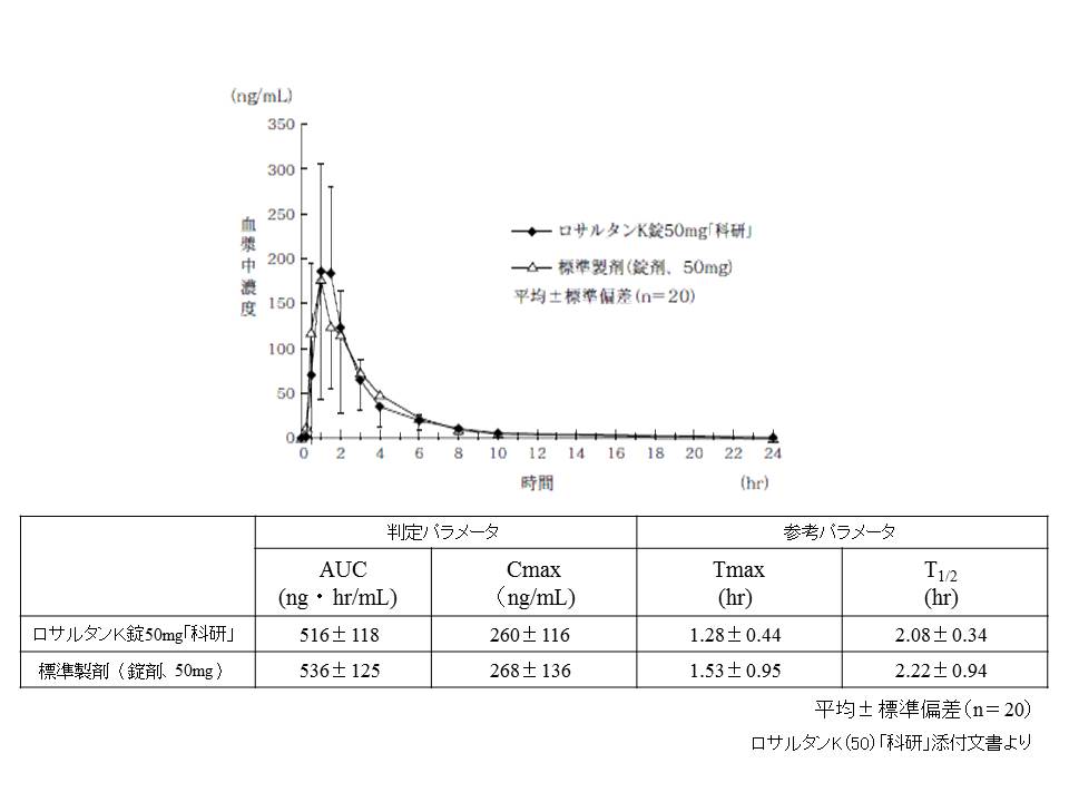 健康成人男子にロサルタンK50mg「科研」と標準製剤のそれぞれ1錠(ロサルタンとして50mg)を、絶食単回傾向投与して