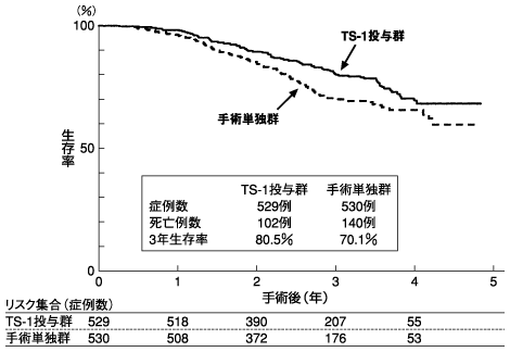 手術後3年の生存率は、手術単独群70.1%、TS-1投与群80.5%であった。