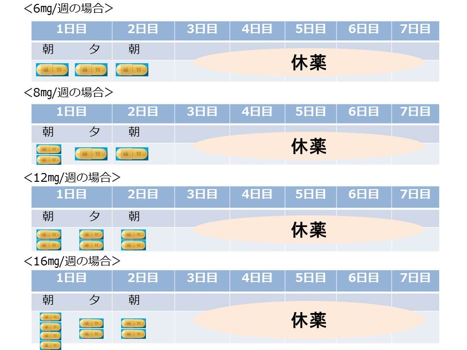 原則として、6mg/週で経口投与を開始し、2~4週毎に10㎎/週前後まで増量します。