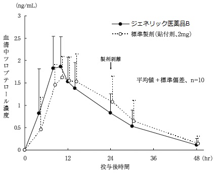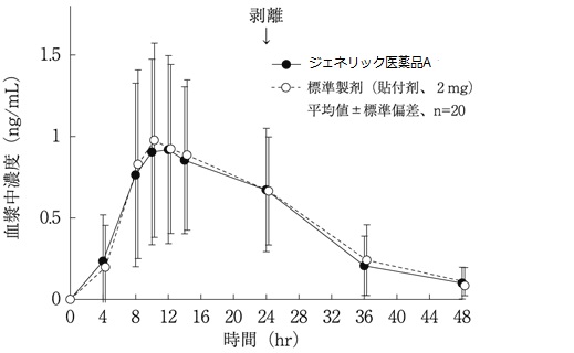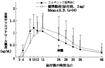 例えば、以下のデータは標準品(本剤)とジェネリック医薬品を比較した血中濃度推移を示したデータになります。(添付文書より抜粋)3製剤ともホクナリンテープと同一とされている製剤ですが、下図のように血中濃度の推移に製品間で差が生じます。