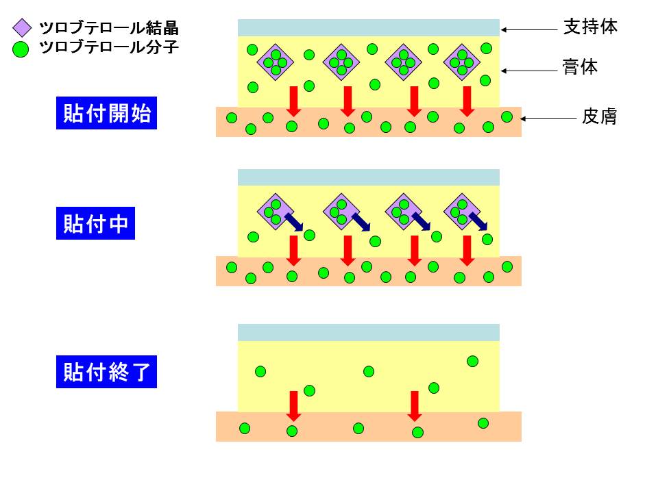 このようにして膏体中のツロブテロール分子の濃度を一定に保つことができます。つまり、ツロブテロール結晶が分子の貯蔵庫の役割を果たすことで、薬物放出量を常に一定に保つことができる設計となっています。