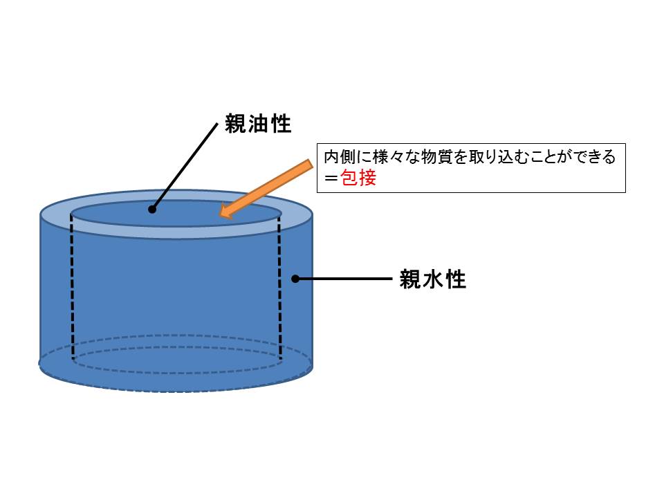 CDはオリゴ糖が環状に連なっている構造をしており、構造的にはちょうどフタと底がなくなったカップのような形をしています。外側は水に溶けやすい親水性を示し、その内側は油分に溶けやすい親油性をもつ二重構造となっています。CDの内側は小さい物質が入り込めるような構造になっていて、内部に様々な分子を取り込むことを包接といいますが、CDは水に溶けない物質を内側に包接することで水に溶解させることができるようになります。このように本来水に溶かすことができない物質をCDが可溶化させることができる性質を利用し、医薬品の製剤化に応用されることがあります。
