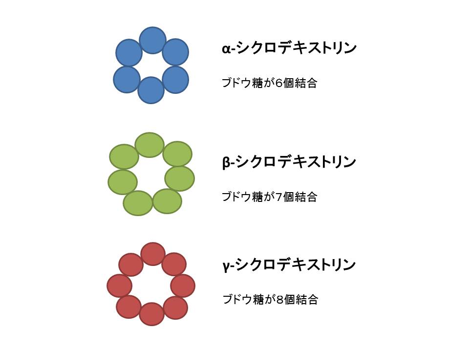 CDはグルコースが環状に結合したものですが、一般的には6〜8個のグルコースが結合していることが多く、結合しているグルコースの数によりα、β、γの3つに分けられます。グルコースが6つ結合したものをα-CD、7つ結合したものをβ-CD、8つ結合したものをγ-CDといい、これらは性質がそれぞれ異なっており、その性質を活用し、医薬品等に応用されています。