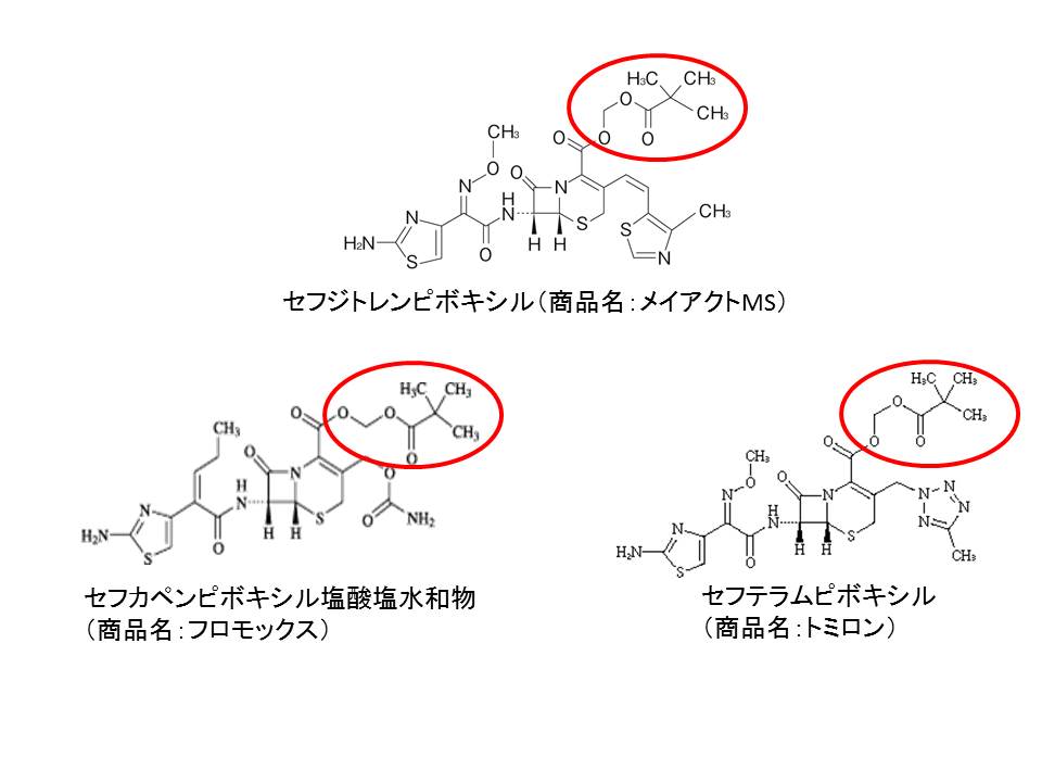 ピボキシル基を有する抗生剤を長期間使用すると、分解されてできたピバリン酸によって低カルニチン血症を起こして低血糖症状を起こす可能性があります。やむを得ない理由などで長期間使用する必要がある場合は、この化学構造を持たない別の抗生剤に変更する方がよいでしょう。