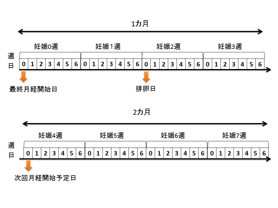 月経周期を28日とするとだいたい2週0日で排卵が起こり、受精が起こります。妊娠が成立しなかった場合は4週0日に次の月経が始まります。このようにして妊娠週数を数えていきます。