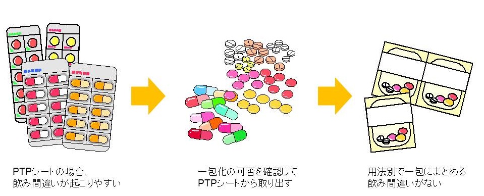 高齢者や疾患によっては投与されている薬剤が多いことがあり、患者の飲み間違いや飲み忘れを防止するために一包化処方とすることが多くあります。またはリウマチなどの疾患によりヒート包装を開封するのが困難な場合も一包化を行うことがあります。1包化を行う場合は、医師の指示が必要となります。薬剤師が服薬指導等で必要と判断する場合は、必ず処方医へ確認をする必要があります。