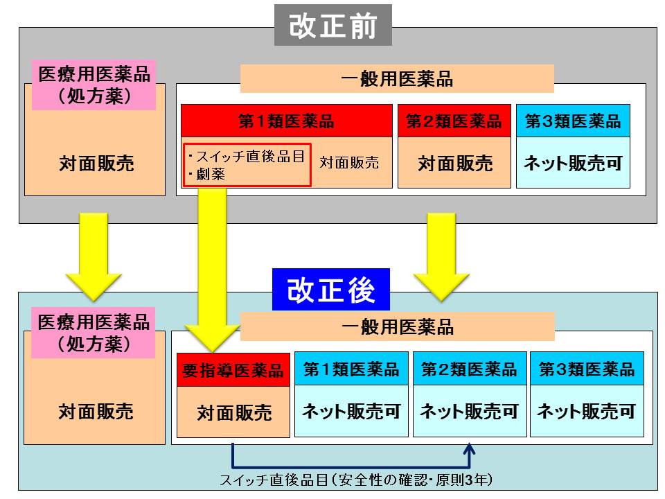 新たなルールでは、医薬品の区分を見直し、使用に特に注意が必要な一部の医薬品を要指導医薬品という新しい区分を設けて対面販売にのみ限るとし、第1類、第2類、第3類医薬品のすべてをインターネットや電話などで販売することができるようになりました。