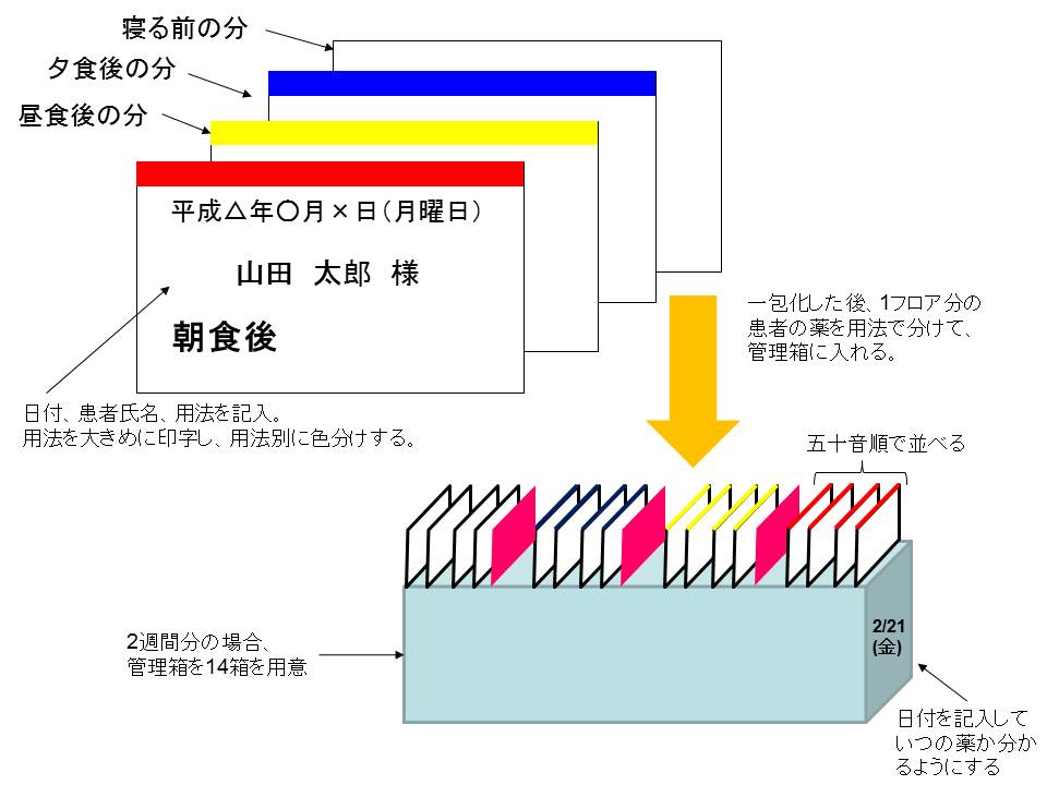 私の薬局では一包化に使用する分包紙には患者の氏名、日付、用法を印字していました。さらに印字のみでは分りにくいため、一目見て判別できるように用法別でラインマーカーで色をつけたりして、飲み間違いをなくせるような工夫をしていました。
