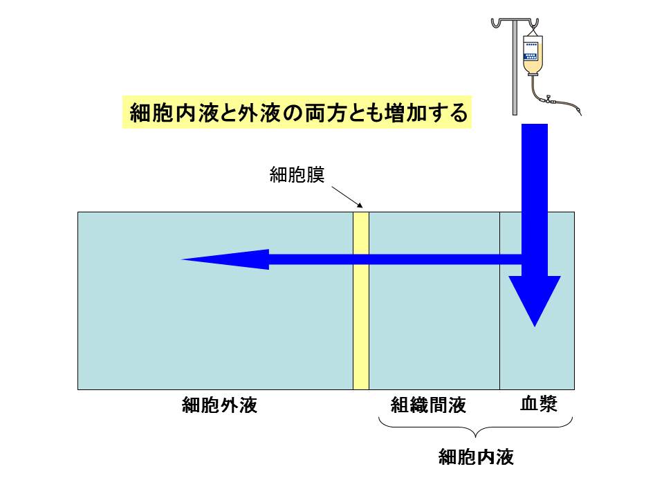 等張性の輸液は細胞内へは移行せず、細胞外にのみ分布して細胞外液(組織間液と血漿)量を増やす輸液になります。下痢や嘔吐、外傷、火傷などが起こると細胞外液が失われてしまいますので、等張性電解質輸液で水、電解質の不足を補うことになります。