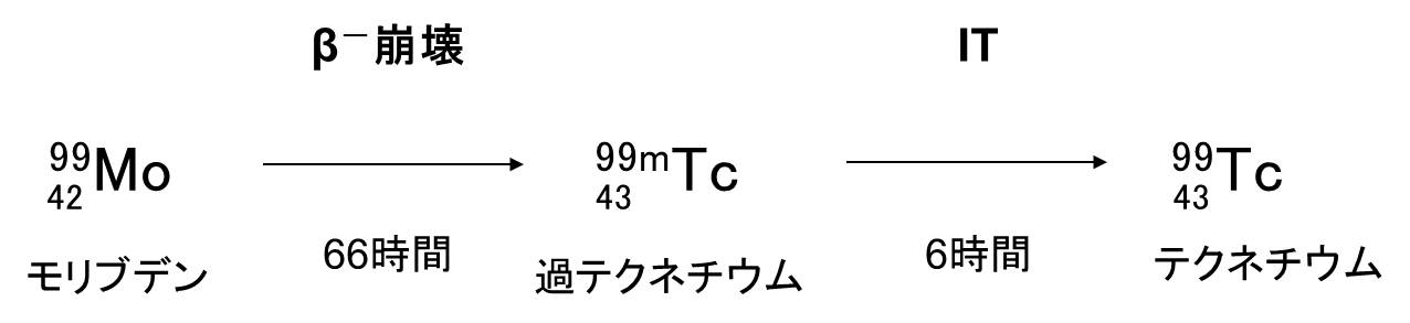 β-崩壊は、原子核の中の中性子1個が陽子に入れかわることで、核のエネルギー状態が安定することをいいます。99Moは66時間の半減期でβ-崩壊によって、中性子が陽子に入れかわることで原子番号が一つ増えて99mTcに変わります。